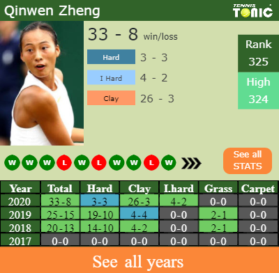 Qinwen has a 33-8 win-loss record in 2020, 4-2 on indoor hard courts (See FULL STATS).
