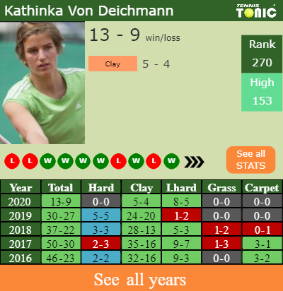 Von Deichmann has a solid win-loss record in the last 6 years having won 63% of her matches (318-189). 8-5 on indoor hard courts in 2020. Regarding her performance on the same surface of this event, Von Deichmann has a 47-34 record in the last 6 years on indoor hard courts.