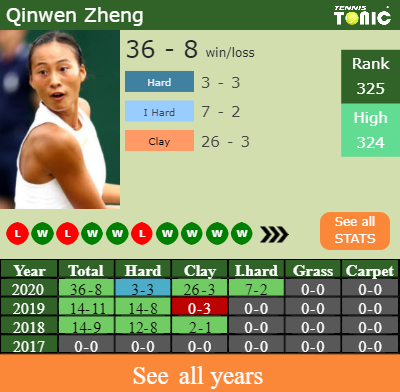 Qinwen has a 36-8 win-loss record in 2020, 7-2 on indoor hard courts (See FULL STATS).
