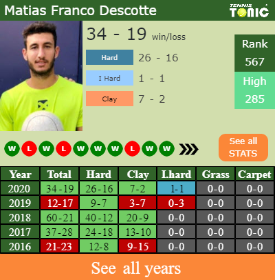 Franco Descotte has a 34-19 win-loss record in 2020, 26-16 on hard (See FULL STATS).