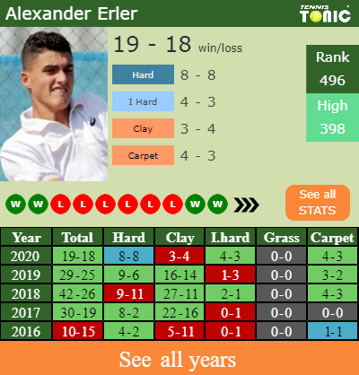 The Austrian has a 19-18 win-loss record in 2020, 8-8 on hard (See FULL STATS).