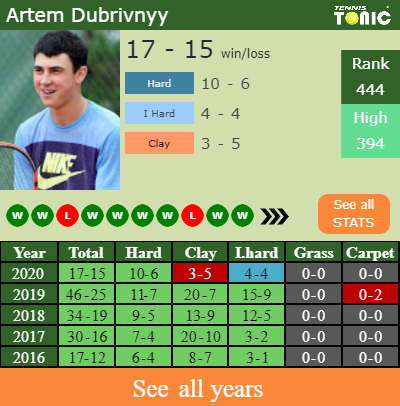 Dubrivnyy has a 17-15 win-loss record in 2020, 10-6 on hard (See FULL STATS).