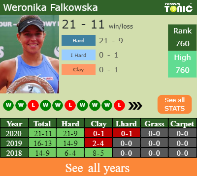 Falkowska has a 21-11 win-loss record in 2020, 21-9 on hard (See FULL STATS).