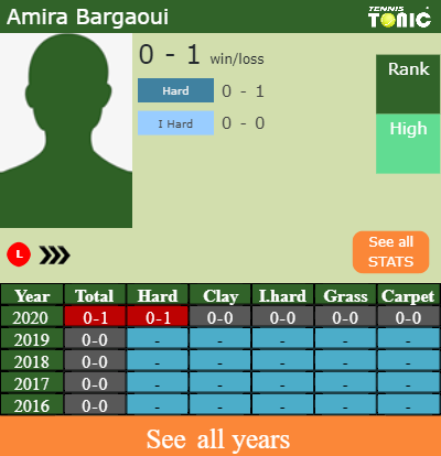 Bargaoui has a 0-1 win-loss record in 2020, 0-1 on hard (See FULL STATS).