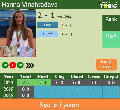 Vinahradava has a 2-1 win-loss record in 2020, 2-1 on hard (See FULL STATS).