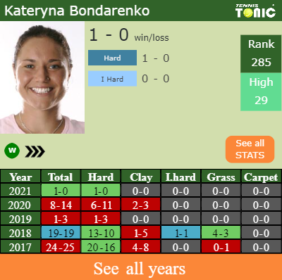 Kateryna has a 1-0 win-loss record in 2021, 1-0 on hard (See FULL STATS).
