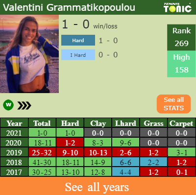 Grammatikopoulou has a solid record in the last 7 years having won 61% of her matches (229-144). 1-0 on hard in 2021. Regarding her performance on the same surface of this competition, Grammatikopoulou has a 86-42 win-loss record in the last 7 years on hard.