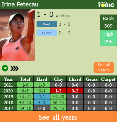 Fetecau has a 1-0 win-loss record in 2021, 1-0 on hard (See FULL STATS).