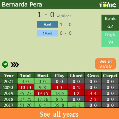 Pera has a solid match record in the last 6 years having won 60% of her matches (150-100). 1-0 on hard in 2021. Regarding her performance on the same surface of this competition, Pera has a 50-49 win-loss record in the last 6 years on hard.