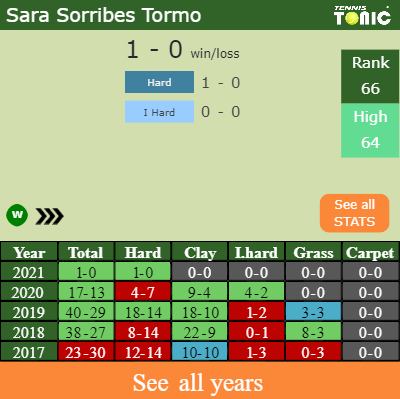 Both Pera and Sorribes Tormo played 1 match. At the moment, Bernarda Pera surrendered 1 set while Sara Sorribes Tormo hasn’t surrendered a set so far. Pera has played 1 set more than Sorribes Tormo (3 vs 2). Therefore, Pera played 13 games more than Sorribes Tormo. The American scored 33 winners (27% of the total points). On the other side, Sara blasted 30 winners (41%).