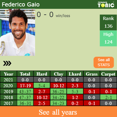 This will be the 2nd time that Federico Gaio and Alexandre Muller play each other. The head to head is 1-0 for Gaio (see full H2H stats), but they have never played each other on hard.