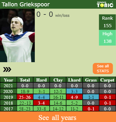 Ranked no. 155, Griekspoor will start his run at the Australian Open Qualifying after he played his last match in the Lisbon Challenger where he lost 6-1 0-1 ret. to Muller in the 2nd round on the 13th of October.