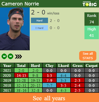 Norrie has a 2-0 win-loss record in 2021, 2-0 on hard (See FULL STATS).
