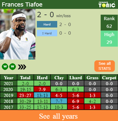 Tiafoe has a winning win-loss record in the last 8 years having won 59% of his matches (233-163). 2-0 on hard in 2021. Talking about his performance on the same surface of this tournament, Tiafoe has a 105-76 match record in the last 8 years on hard.