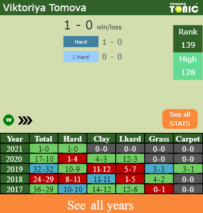 Tomova has a winning win-loss record in the last 6 years having won 59% of her matches (174-120). 1-0 on hard in 2021. Regarding her performance on the same surface of this tournament, Tomova has a 45-37 record in the last 6 years on hard.