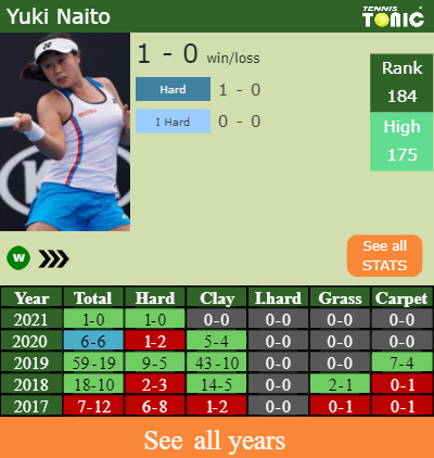 Naito has a solid record in the last 6 years having won 64% of her matches (96-54). 1-0 on hard in 2021. Regarding her performance on the same surface of this event, Naito has a 22-22 win-loss record in the last 6 years on hard.