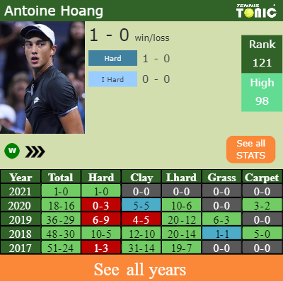 Hoang has a solid record in the last 6 years having won 62% of his matches (192-120). 1-0 on hard in 2021. Regarding his performance on the same surface of this competition, Hoang has a 18-20 record in the last 6 years on hard.