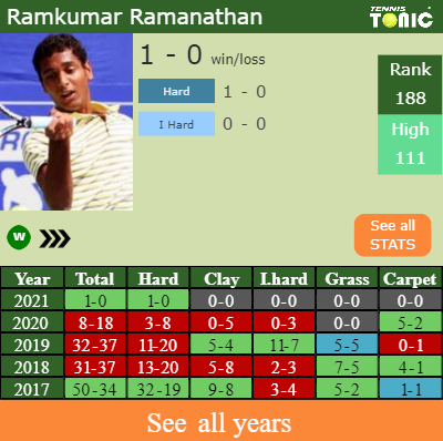 Ramanathan has a winning match record in the last 9 years having won 57% of his matches (310-238). 1-0 on hard in 2021. Talking about his performance on the same surface of this competition, Ramanathan has a 203-134 record in the last 9 years on hard.