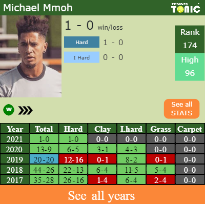 Mmoh has a solid match record in the last 9 years having won 60% of his matches (200-136). 1-0 on hard in 2021. Talking about his performance on the same surface of this competition, Mmoh has a 127-83 match record in the last 9 years on hard.