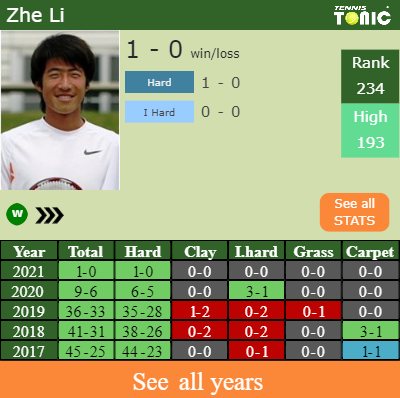 Zhe has a 1-0 win-loss record in 2021, 1-0 on hard (See FULL STATS).