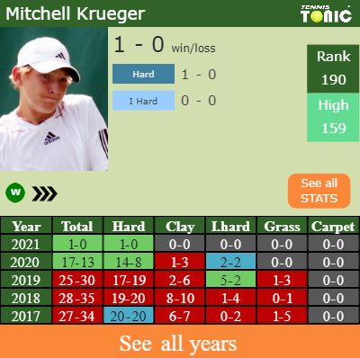 Talking about serving, Krueger was unable to score even 1 ace for the entire match and he was very consistent in conceding no double faults for the entire match. Mitchell Krueger conceded no breaks for the entire match to put NAN% of his first serves in, win NAN% (/) of the points behind his 1st serve and NAN% (/) on the 2nd serve.