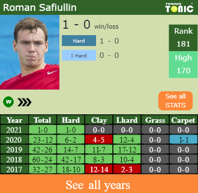 Safiullin has a fantastic match record in the last 9 years having won 70% of his matches (281-122). 1-0 on hard in 2021. Regarding his performance on the same surface of this event, Safiullin has a 181-58 win-loss record in the last 9 years on hard.