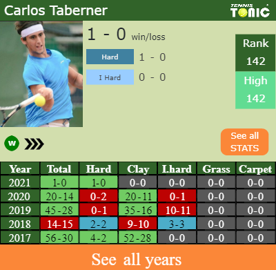 Taberner has a solid match record in the last 7 years having won 66% of his matches (262-135). 1-0 on hard in 2021. Regarding his performance on the same surface of this competition, Taberner has a 17-11 match record in the last 7 years on hard.