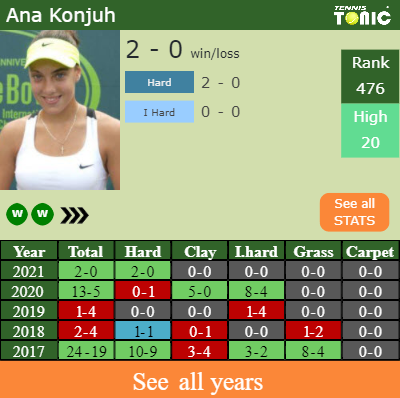 Konjuh has a 2-0 win-loss record in 2021, 2-0 on hard (See FULL STATS).