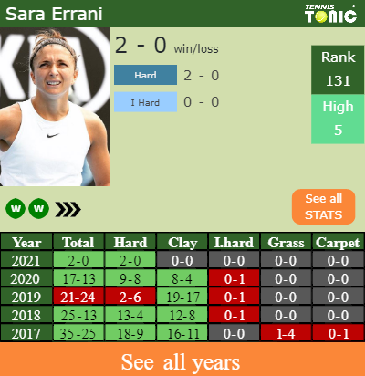 Errani has a solid win-loss record in the last 10 years having won 61% of her matches (308-197). 2-0 on hard in 2021. In connection with her performance on the same surface of this competition, Errani has a 134-93 win-loss record in the last years on hard.