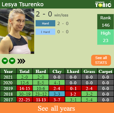 Tsurenko has a 2-0 win-loss record in 2021, 2-0 on hard (See FULL STATS).