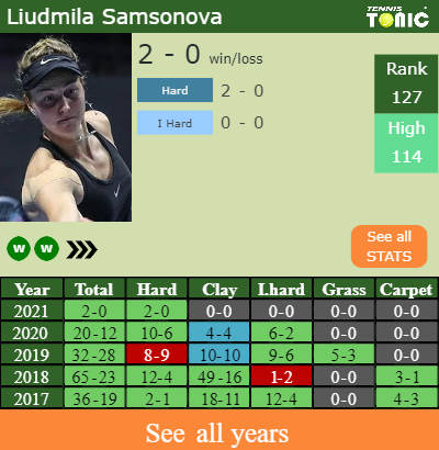 Samsonova has a solid match record in the last 6 years having won 65% of her matches (168-91). 2-0 on hard in 2021. Talking about her performance on the same surface of this event, Samsonova has a 35-21 match record in the last 6 years on hard.