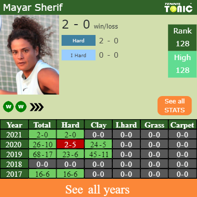 Sherif has a fantastic record in the last 5 years having won 70% of her matches (150-63). 2-0 on hard in 2021. In connection with her performance on the same surface of this competition, Sherif has a 58-32 win-loss record in the last 5 years on hard.