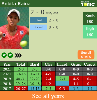 Raina has a winning match record in the last 8 years having won 56% of her matches (258-199). 2-0 on hard in 2021. In connection with her performance on the same surface of this tournament, Raina has a 201-134 match record in the last 8 years on hard.
