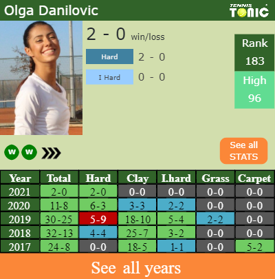 Olga has a 2-0 win-loss record in 2021, 2-0 on hard (See FULL STATS).