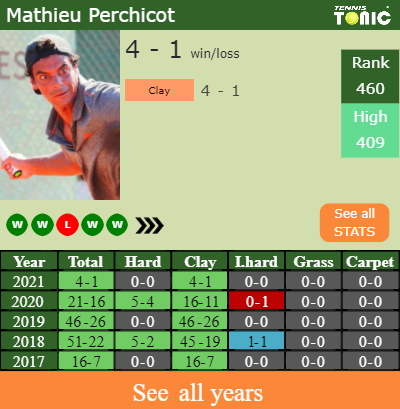 Perchicot has a solid match record in the last 6 years having won 66% of his matches (141-73). 4-1 on clay in 2021. Talking about his performance on the same surface of this event, Perchicot has a 130-65 record in the last 6 years on clay.