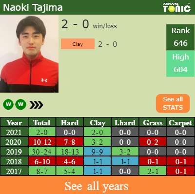 The Japanese has a 2-0 win-loss record in 2021, 2-0 on clay (See FULL STATS).