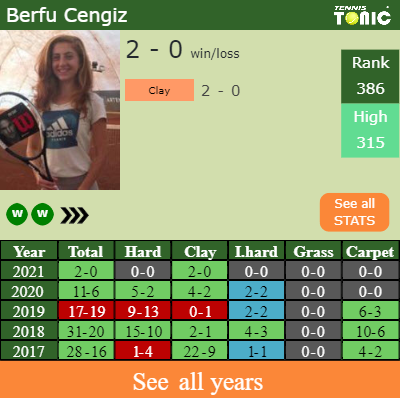 Berfu has a 2-0 win-loss record in 2021, 2-0 on clay (See FULL STATS).