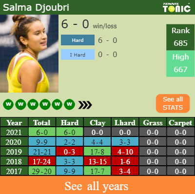 Salma has a 6-0 win-loss record in 2021, 6-0 on hard (See FULL STATS).