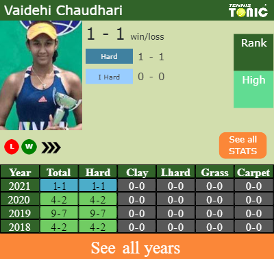 Vaidehi has a 1-1 win-loss record in 2021, 1-1 on hard (See FULL STATS).