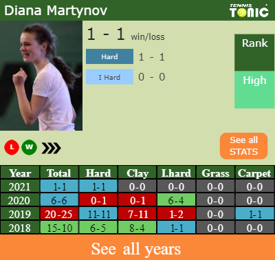Martynov has won exactly 50% of her matches (42-42) in the last 4 years. 1-1 on hard in 2021. In connection with her performance on the same surface of this competition, Martynov has a 18-18 match record in the last 4 years on hard.