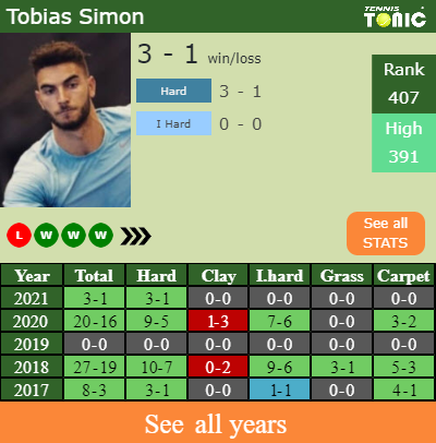 This will be the 4th time that Tobias Simon and Evan Furness clash against each other. The head to head is 2-1 for Simon (see full H2H stats), but Furness leads 1-0 on hard.
