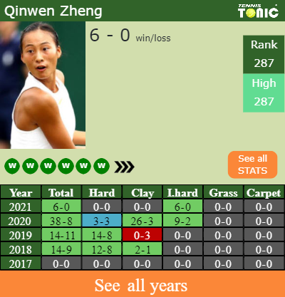 Zheng has a fantastic record in the last 5 years having won 72% of her matches (72-28). 6-0 on indoor hard courts in 2021. In connection with her performance on the same surface of this tournament, Zheng has a 15-2 record in the last 5 years on indoor hard courts.