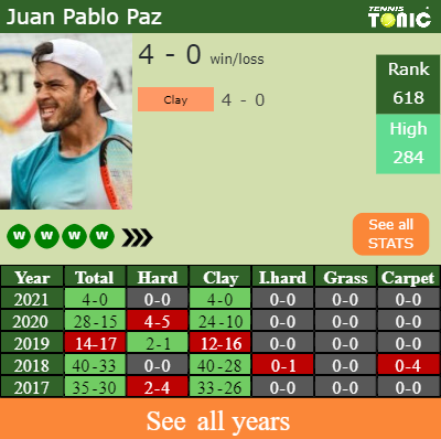 Pablo Paz has a solid match record in the last 8 years having won 60% of his matches (268-177). 4-0 on clay in 2021. Talking about his performance on the same surface of this competition, Pablo Paz has a 260-162 win-loss record in the last 8 years on clay.