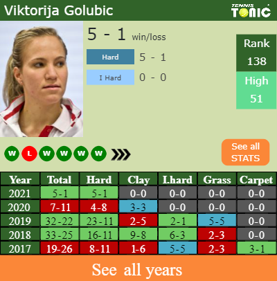 Golubic has a solid record in the last 10 years having won 61% of her matches (291-186). 5-1 on hard in 2021. Regarding her performance on the same surface of this event, Golubic has a 102-62 match record in the last years on hard.