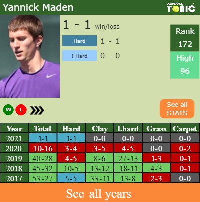 This will be the 2nd time that Yannick Maden and Thomas Fabbiano face off. The head to head is 1-0 for Maden (see full H2H stats), but they have never played each other on indoor hard courts.