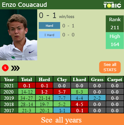 Enzo has a 0-1 win-loss record in 2021, 0-0 on indoor hard courts (See FULL STATS).