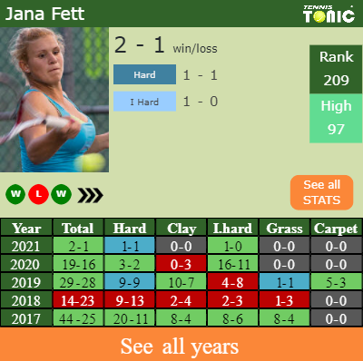 Fett has a solid win-loss record in the last 8 years having won 61% of her matches (243-158). 1-0 on indoor hard courts in 2021. Talking about her performance on the same surface of this competition, Fett has a 72-38 match record in the last 8 years on indoor hard courts.