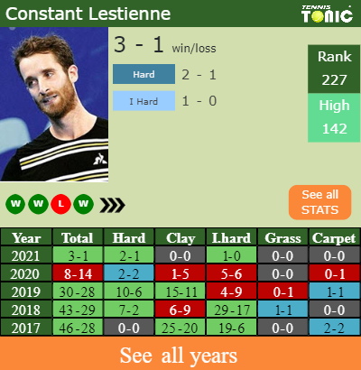 Talking about serving, Lestienne was unable to score even 1 ace for the entire match and he was exceptionally steady in conceding no double faults for the entire match. Constant Lestienne conceded no breaks for the entire match to put NAN% of his first serves in, win NAN% (/) of the points behind his 1st serve and NAN% (/) on the 2nd serve.