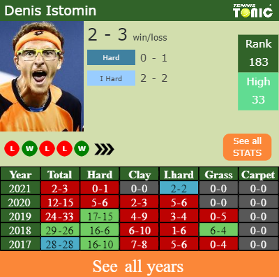 Istomin has a 2-3 win-loss record in 2021, 2-2 on indoor hard courts (See FULL STATS).