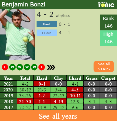 In terms of his career, Bonzi has an overall 202-123 record. He has a positive 46-38 record on indoor hard courts.